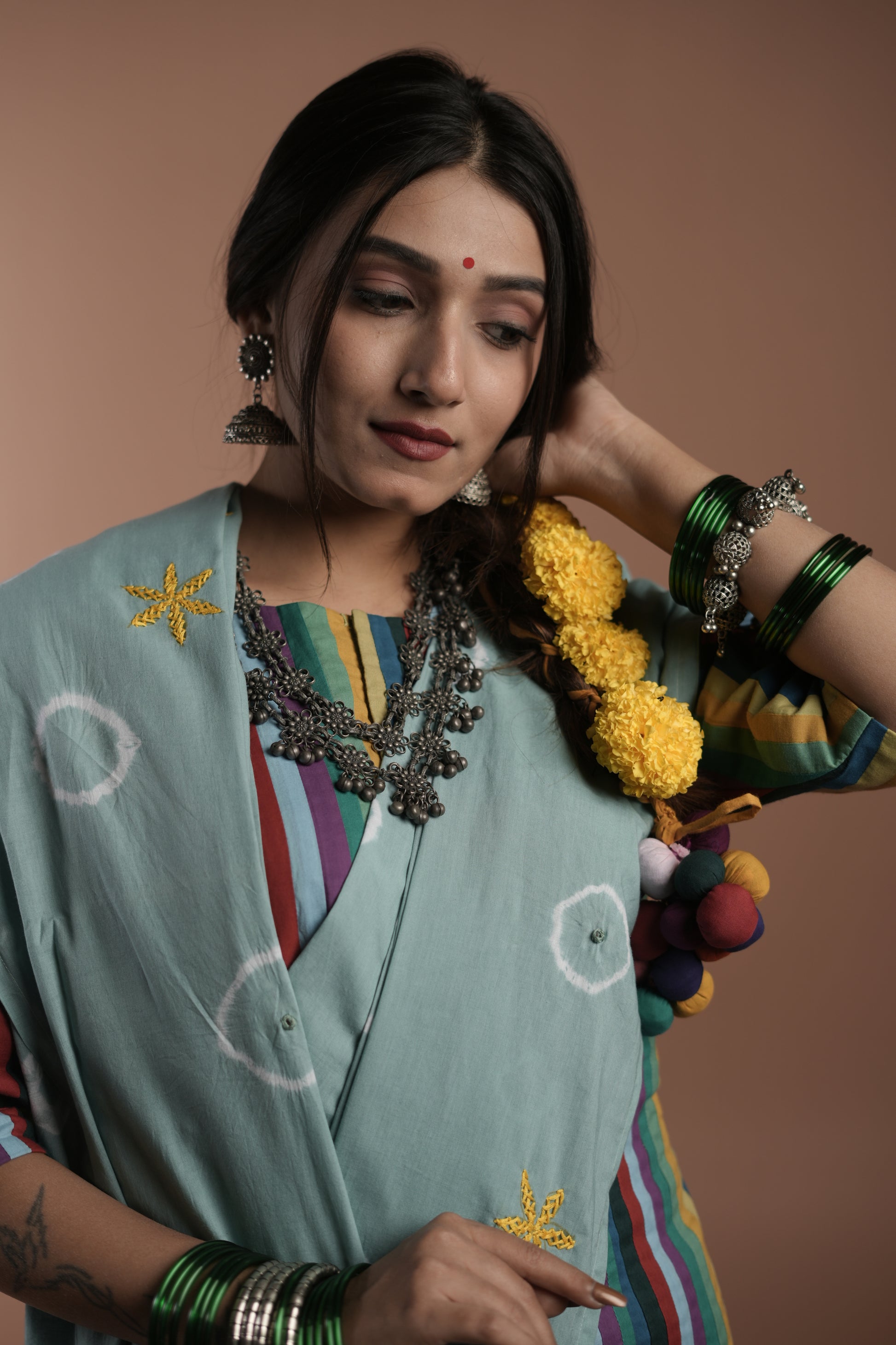 The tie and dyed saree is crafted from soft durable and breathable cotton fabric.